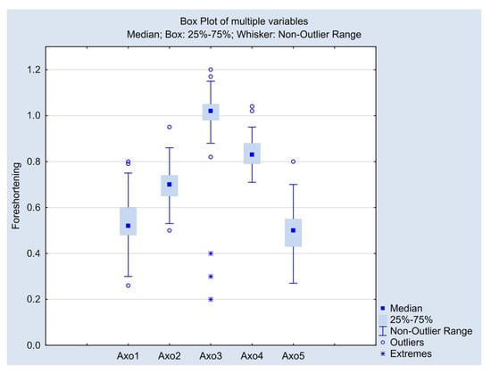 Box plots of axonometric test results. Median, interquartile range (IQR), non-outlier range, outliers and extremes are shown.