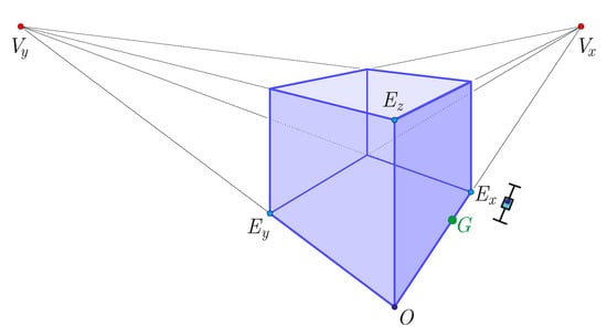 Students received 5-5 tasks of one-point, two-point, and three-point perspective drawing, separately. Let , , be the unit points, , , be the vanishing points of x, y and z axes, respectively, while the origin is denoted by O. always exists (i.e., it is in finite position); therefore, we can compute the so-called depth ratio (briefly depth) , of the perspective image cube along the x-axis by the ratio of the edge length of direction x of the cube and the distance of the origin and the vanishing point . In the case of two- and three-point perspectives, one can analogously calculate the depth ratio along the other two axes by and, in the case of the three-point perspective, .