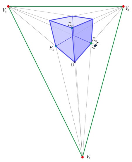 Consider first the so-called axonometric representation, which plays a crucial role in many applications in knowledge production (for a detailed discussion of this method, see, e.g., [13]). An axonometric image of a cube or any general cuboid is fairly easy to produce. For simplicity, imagine that the three extensions of the cuboid are in the x, y, and z axes mutually perpendicular to each other, with one vertex at the origin. Let us fix a point, the image of the origin, in the drawing plane and three half-lines starting from it, the images of the three axes. Taking an additional vertex on each of these half-lines, separately, the image of the cuboid is already uniquely defined, we only need to draw parallel segments from the corresponding points to finalize the figure. If the spatial cube is considered to be of unit edge-length, then it is evident that in the drawing, not all edges of the image will necessarily be of unit length, but the parallel edges will be the same length in each direction. The ratio of the original edge length to the edge length shown in the drawing is characterized by the foreshortening values , , and in the three directions, separately. These values can freely be chosen by the person who prepares the drawing.
