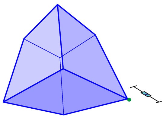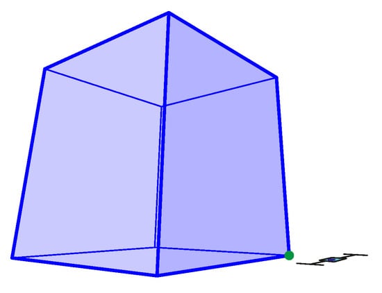 We have provided five different two-point perspective tasks, where, again, students were able to adjust the depth ratio along the x axis by moving one single point, . In the case of the two-point perspective, although all figures can be technically correct as a perspective drawing, there is one single solution where the drawing can be a result of a central projection, due to Stiefel [19]. This single solution is presented in the figures as point G (green), and the associated depth ratio is listed in the first row of Table 4, as the expected value.