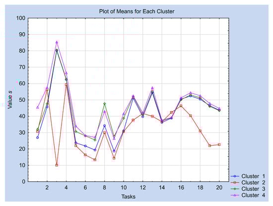 Five-five tasks of axonometric, one-point perspective, two-point perspective and three-point perspective drawings in this order have been provided to the test participants (students of arts and engineering) to find the common sense, if it exists, of seeing a cube (and not a general cuboid). Most students found their best view and foreshortening in a remarkably narrow interval, with small deviation, confirming that there is such a common view. However, different additional lessons learnt from each type of task were provided. We sorted the students into four clusters by the software Statistica, and we found that the results of the students in three clusters differ slightly, while the fourth cluster is spectacularly and significantly different from the other three (see Figure 26). Cluster 2 contains only three engineering students out of 153. The values sent by them are extremes, as perhaps they did not understand the task or they have slightly different spatial abilities than the majority. The numbers of the members of the other three clusters, Cluster 1, Cluster 3 and Cluster 4, are 61, 45 and 44, respectively. The ratios of the arts and engineering students in the clusters, respectively, are 75–25%, 87–13% and 48–52%, while this ratio in the case of all the students is 70–30%. We found that there is only a slight difference considering Cluster 1, Cluster 3 and Cluster 4 in one-point perspectives, but Cluster 2 has a relevant difference from the others in most of the tasks.