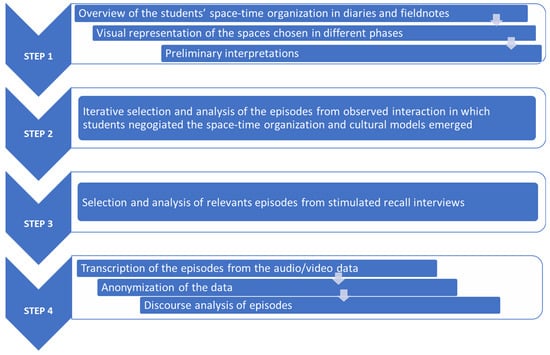 First, the diaries and the researchers’ fieldnotes were used to create an overview of the students’ space–time organization during the course. To examine self-organization, it is fruitful to think in terms of the emergence of multiple heterogeneous and often overlapping physical, symbolic, virtual, and social spaces [43]. For example, physical spaces such as classrooms and laboratories may overlap with socially organized spaces involving intimate, social, and public zones, and with multiple symbolic/virtual spaces of books, blackboards, computers, etc. Tables and visual representations summarizing the virtual, social, and material spaces chosen by the students in different phases of the collaboration were developed. During this step, the researchers deleted references to proprietary software, using the generic label of the technological tool mentioned (e.g., spreadsheet, word processor, programming software). Based on the analysis carried out in this first step, the researchers developed preliminary interpretations that were progressively refined during the following steps.