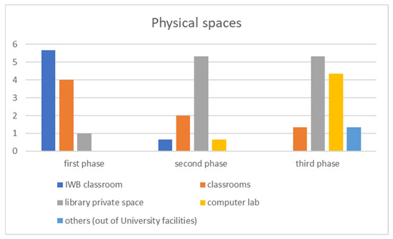 Figure 2 represents the use of the different physical spaces during the course. In particular, the figure shows the average number of sessions that each student spent in each physical space. The figure was created based on the students’ mentions of each space in the learning diaries. Table 1 and Figure 1 show that the three phases of the course were characterized by different patterns of self-organization.