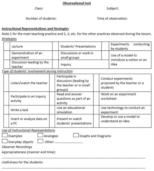 Taking into consideration the purpose of our study, to collect data related to science teachers’ everyday classroom practices, the following instruments were used: a student questionnaire, an observation tool, and a scoring rubric. All the instruments focused on specifically formed criteria deriving from aspects of PCK.