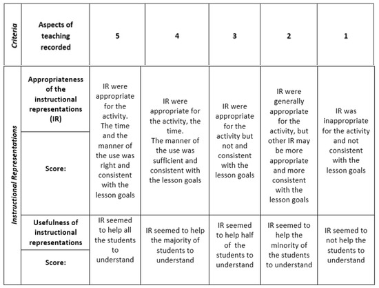 In the scoring rubric, the observer finds the observed aspects of teaching in each criterion and five short descriptions of the teacher’s performance. Based on the observation tool and his/her recorded notes, the observer decides which description best fits the teacher’s actions. Each description corresponds to a score that the observer inserts under each aspect. The descriptions were formulated by the researchers after a long collaboration with experienced teachers and qualified teacher evaluators. A part of the scoring rubric concerning the use of instructional representations is presented in Figure 2. Upon completion of the observations, the evaluator grades the teaching in the rubric.