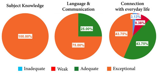 The results also indicate that a large percentage of teachers was successful in connecting content (concepts and phenomena) to everyday life: ‘Connecting science to students’ everyday life experiences is an important theme in science education discourse’ [43] (p. 107). It is argued that making connections of content with everyday life is an important pedagogical tool for motivating students (e.g., [43]). There was only a small number of Lyceum teachers who were not successful in this aspect. This could be due to the fact that Lyceum textbooks do not include connections between topics and everyday life compared to the books of the lower level of secondary education.