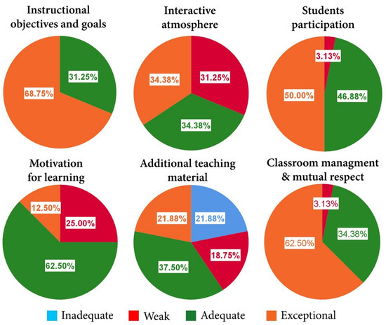 The data collected by the questionnaire were statistically analysed and, for the total sample, Cronbach’s alpha was calculated to be 0.921. According to the literature (e.g., [35]), questionnaires investigating opinions or perceptions are considered reliable when Cronbach’s alpha is higher than 0.7. Our questionnaire is therefore considered highly reliable. Cronbach’s alpha was also calculated for each sub-sample of students and concerned each individual teacher, and calculated values ranged from 0.806 to 0.906, which indicated that the questionnaire is reliable for individual evaluation as well.