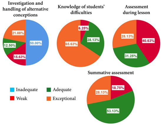 The use of formative assessment during the lesson allows teachers to record the level of their students’ understanding. The results showed that about 6 out of 10 teachers use assessment methods successfully or adequately (28% and 31%, respectively) and adjust their lesson to meet the students’ needs. However, 4 out of 10 (40.63%) who were graded as weak, seem to use assessment only for compliance with the rules set by the syllabus or without adjusting their lesson based on the students’ responses.