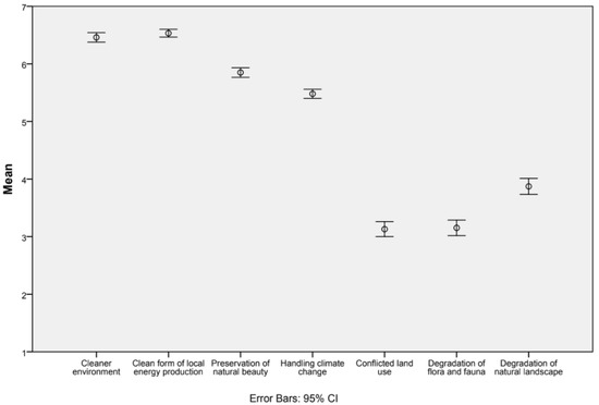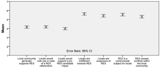 Perceptions of RES’ possible negative environmental impact on local communities are clearly less widespread. There is little support of the perception that RES infrastructure will result in land use conflicts (M = 3.09, SD = 1.44) or that local flora and fauna will be degraded (M = 3.00, SD = 1.42). Finally, the perception that the landscape will change due to RES has a moderate acceptance (M = 3.81, SD = 1.89).