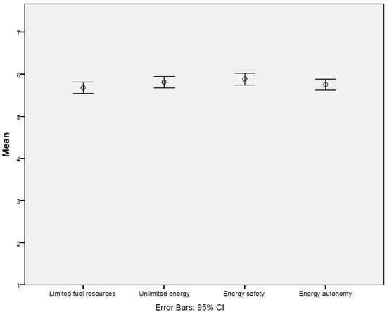 Regarding RES’ technological impact (Figure 2), teachers strongly believe that RES is the answer to limited traditional fuel resources, which will sooner or later come to an end (M = 5.68, SD = 1.56). Regarding RES’ energy supply sufficiency, teachers believe that RES can provide sustainable energy capable of meeting local needs, without limitations (M = 5.80, SD = 1.43). Specifically, they believe that RES can provide energy security to local communities because the latter will no longer depend on external energy producers and providers (M = 5.89, SD = 1.29) and that the islands can—through RES—be autonomous in terms of energy production and energy distribution (M = 5.76, SD = 1.46). It is worth mentioning that our items measured both positive and negative aspects of RES perceptions, in an attempt to include a wide representation of relevant literature. For analysis purposes, reverse coding was used, where applicable.