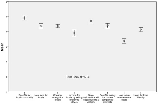 Regarding RES’ socio-economic impact (Figure 3), teachers generally believe that RES will result in economic benefits for the islands. They are nevertheless suspicious of companies that will install and financially exploit RES infrastructures, and they mistrust the state’s role. Specifically, it is widely accepted that local development of RES will economically benefit the local community (M = 5.92, SD = 1.17). Furthermore, teachers believe that—through local development of RES—new jobs will be created for locals (M = 5.41, SD = 1.37). Teachers also believe that, via RES’ local development, electricity prices will decrease for the local community (M = 5.37, SD = 1.37) and that the local community can even profit by selling energy to third parties (M = 4.91, SD = 1.56). At the same time, however, there is a strong belief that state-owned RES infrastructures will be subjects of poor administration (M = 5.72, SD = 1.35) and that RES’ local development will only serve private sector’s interests (M = 5.40, SD = 1.66). Slight reservations are also expressed that RES installations may require non-affordable installation and maintenance costs that may even make the investment unviable (M = 4.39, SD = 1.54). However, despite the perceptions that RES will benefit the local community, teachers also believe that RES’ installations would be incompatible with local citizens’ place-related values, because residents’ local identity may be altered and is thus vulnerable (M = 5.15, SD = 2.14).