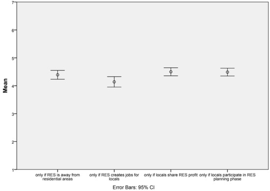 These very positive attitudes towards RES’ local development are countered by some terms that teachers would like to see as pre-requirements (Figure 5). Specifically, teachers appear undecided regarding whether RES facilities should only be placed at a distance, far away from residential areas (M = 4.39, SD = 1.71), should only occur if new jobs are created for locals (M = 4.13, SD = 1.56) or if the local community has a share of the RES profits (M = 4.51, SD = 1.52), and if (the local community) actively participates in the investments’ planning phase (M = 4.47, SD = 2.07). These factors scored mean values of around 4, which is in the middle of the scale.