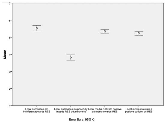 Teachers similarly perceive local authorities are indifferent towards RES’ local development (M = 5.53, SD = 1.76) (Figure 7). However, it should be mentioned that teachers do not support the idea that local authorities deliberately impede RES’ development (M = 3.82, SD = 1.71). Regarding local media, teachers maintain different perceptions, mainly believing that the media actively try to cultivate readers’ positive attitudes towards RES (M = 5.35, SD = 1.23), informing the audience about RES’ advantages (M = 5.23, SD = 1.26).