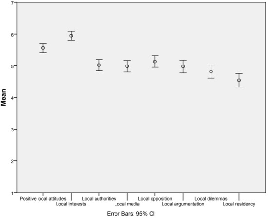 Teachers’ perception of how the local community feels towards RES differs vividly compared to teachers’ own perceptions towards the issue (Figure 6). Teachers appear undecided whether the local community is in favor of RES development (M = 4.15, SD = 1.48) and whether, in the event of a referendum, the local community would vote in favor of RES local development (M = 4.17, SD = 1.45), scoring with mean values of around 4. The belief that the local community would vote for a mayor that promoted RES’ development is unpopular (M = 3.97, SD = 1.44). On the contrary, it is widely accepted that the local community is indifferent to RES’ development (M = 5.62, SD = 1.61), and/or that it is suspicious of such a prospect (M = 5.40, SD = 1.60). The beliefs that RES remains a controversial issue that provokes reactions among the local community (M = 5.54, SD = 1.67), and that RES is furthermore a source of conflict for the local community (M = 5.31, SD = 1.65), are widespread.
