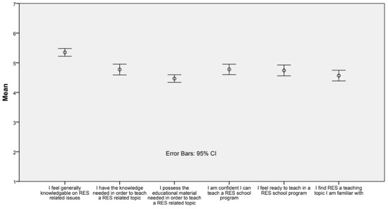 Regarding teachers’ perceptions about their degree of control of possibly teaching an RES-related school program (Figure 9), although teachers feel that they are generally aware of RES-related issues (M = 5.35, SD = 1.41), they appear to have moderate confidence in their ability to teach RES-related topics. In particular, they believe that they marginally possess both the knowledge necessary to teach an RES-related topic (M = 4.77, SD = 1.77) and the relevant educational material (M = 4.45, SD = 1.77) required to successfully teach a RES educational program. Similarly, teachers assess their confidence to teach RES topics as marginally positive (M = 4.78, SD = 1.98), with similar scores regarding their readiness (M = 4.74, SD = 1.98) and their familiarity with teaching this specific topic (M = 4.57, SD = 1.96).