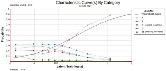 In Figure 2, we can notice that the most attractive wrong option was B (blue dotted line), which was chosen by a high percentage of students, including those of medium and medium-high level of abilities. The curve began to decrease only beyond medium levels (which in the graph corresponds to 0 on the x-axis) of students’ abilities in the test. The curves of the other two options decreased, and they were chosen by students of low and medium ability because the points of inflection correspond to low values of the x-axis. Finally, it can be noted that only a few students did not answer the question, almost all of whom lowest ability level are.