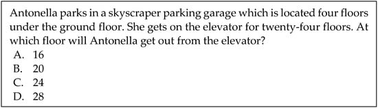 Both problems present a realistic context, and they have multiple-choice questions. To answering the question, the student must either work on the number line and count in a progressive and regressive way or work through an additive model. Both questions, therefore, relate to the conceptual field of additive structures []. The analyses of the following word problems were developed considering the text in the original language and not the text translated into English. Therefore, the following observations may not be found in the English text. For example, subordinate sentences in the same period are commonplace in the Italian language. Question D32 (Figure 4) asks the student to identify the floor where the lift will open, where the student knows the starting floor, and the number of floors to climb.
