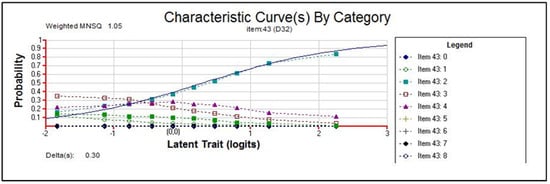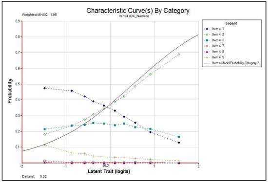 The results of the INVALSI surveys were analyzed using the Rasch model []. It is a logistic model with one parameter that belongs to the question Response Theory (IRT) category and produces a joint estimation of two types of parameters: a difficulty parameter for each test question and an ability parameter for each student. The Rasch model returns the probability that students choose the correct answer to a question, according to the difficulty of the question and the student’s ability measured in the whole test. This probability is represented by a curve called the characteristic curve of the questions. In a similar way, it is possible to represent all the empirical data; in particular, there is a characteristic curve for each option in the case of multiple-choice questions (or for wrong or missing answers in open-ended questions). The graph that collects all the curves is the Distractor Plot (DP).