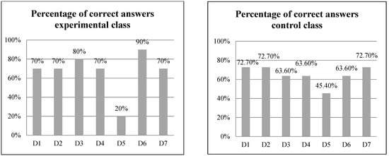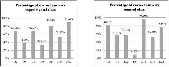 In the previous paragraph, we described the three experimental phases: administration of the pre-test to the whole sample; guided discussion and subsequent workshops with the experimental class; administration of the post-test to the whole sample. In this paragraph, we will describe the results collected at each phase. The first phase of the experimentation was carried out in both sample classes; it consisted of administering the seven items selected from the grade 2 INVALSI test (No. 2, 4, 8, 9, 14, 16, 22). The following graphs show the percentage of correct answers in the pre-test items (Figure 7).