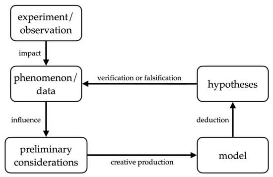 The first modelling process formally used in biological contexts (Figure 1) starts with an experiment or a daily observation [34]. The data obtained on this basis influence the following preliminary considerations. Based on this, a model is generated in creative development, used to create a hypothesis. The hypothesis is then either verified or falsified by further data. In the last case, the cycle is rerun using new data until the hypothesis can finally be accepted.