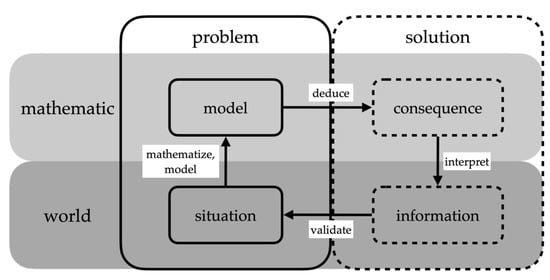 The modelling circle shown in Figure 2 is formally used in mathematical contexts and reduced to the essentials. This process distinguishes in a 2 × 2 design between the world and mathematics as well as between the resulting problem and its mathematical solution [35]. In the chemical context of modelling, mathematics is equal to the model world. The starting point of this modelling process is an outer-mathematical problem (situation). A mathematical model with an inner-mathematical problem is generated from the situation by (mathematical) modelling. Applying mathematical rules and procedures causes an inner-mathematical consequence from the problem. In the next step, the modeller relates the mathematical results to the real world to obtain and check the plausibility of the mathematical results. If the result is not considered a valid answer for the initial situation, the process is rerun.