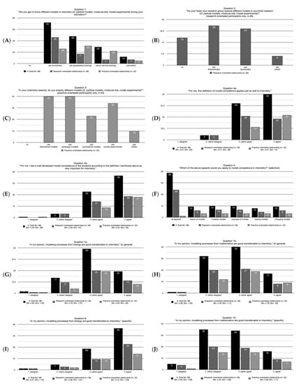 In the first section of the survey, the participants state that they all had experience of various models and mostly during their university education (72 out of 98; A in Figure 3). The chemistry education research models are rarely present, while theoretical and practical research approaches are approximately equally widespread (26 and 24 out of 56; B in Figure 3). In chemistry lessons, all the participants reported that they implement models in their teaching. Theoretical models occur to the same extent as analogue models (40 out of 42, 95.3%). Nevertheless, the teachers also use conceptual models (36 out of 42) and model experiments (34 out of 42, C in Figure 3).