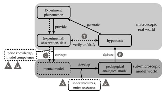 The developed process for modelling in chemistry shown in Figure 4 distinguishes between two different levels: the real macroscopic and the sub-microscopic modelled level. This explicit separation enables the pupils to consciously switch between the macro and sub-micro worlds with their unique peculiarities and regularities. The modelling process starts with a phenomenon that pupils can observe in their everyday lives. This starting point considers the general didactic demand for relevance in chemistry lessons [39]. Conversely, it enables students to understand that they should develop a model [40]. The experiment or phenomenon provides (experimental) data or observations that depend strongly on personal factors (e.g., disciplinary knowledge, theories, attention, [41]). In the following step, the modeller activates their prior knowledge and conceptual model competence (sub-categories ‘nature of models’ and ‘multiple models’, cf. n and M in Figure 4) to form a mental model. Here, a transition takes place in two ways. There is a change from the experiential real world to the model world (in Figure 4: light grey or dark grey background). Conversely, visible (Figure 4: solid outlines) processes become invisible (Figure 4: dashed contours). Using inner (modelling competence, creativity) and outer resources (learning situation, available materials), the modeller generates an analogue representation out of the mental model, a so-called pedagogical analogical model [19]. Mental models are simply a stopover in forming an analogical model. Nonetheless, the discrepancy is essential in analysing pupils’ concepts because mental models and their analogous representations do not necessarily coincide. The analogical model subsequently allows hypothesis generation. In this step, the model world refers to reality, i.e., the learner must once again make a ‘world transition’. This step gives pupils an understanding of the competence dimension’ purpose of models’. Within the macroscopic world, the pupils generate experimental settings or everyday phenomena that provide observations or data to verify or falsify the hypothesis. By testing the hypothesis, learners create a reference to the modelling competence dimension ‘testing models’. In the case of a falsified hypothesis, the modellers go through the cycle again. First, they change their mental model and thus also the analogical model. Through the model modification, the modelling process establishes a relationship to the competence ‘changing models’.