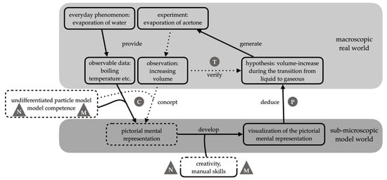 A hypothetical example from school practice on states of matter serves to concretize the proposed modelling process for chemistry (Figure 5). The pupils observe the evaporation of water in their everyday life, for example, when cooking. From this, they derive data, the boiling temperature of the water or the optical properties of water vapour, for example. To explain these data, the pupils activate their prior knowledge of the undifferentiated particle model and their model competence. This activation generates a pictorial representation in the students’ minds–a mental model (pictorial mental representation in Figure 5). Using coloured cardboard or other craft materials, the pupils visualize their mental representation to form a pedagogical analogue model (visualization in Figure 5). For example, circles cut out from cardboard could be arranged at small distances to represent the liquid state and at large distances for the gaseous state. In this step, personal skills (creativity, manual skills) play an essential role. The analogue model is now observable for the teacher and the fellow pupils. From the analogue model, the students then derive, for example, the hypothesis that a certain amount of substance would have to occupy a larger volume after the transition from the liquid to the gaseous state of matter since the movement of the particles increases and the particles occupy the entire available volume. To test the hypothesis, the students then perform the experiment on the evaporation of acetone to exemplify the transitions between the states of matter in a closed system (pointed arrows in Figure 5). They place a few millilitres of acetone into a plastic bag and close it airlessly. Using a hot water bath, the students then heat the acetone and see that the bag inflates. The hypothesis can therefore be accepted, which strengthens the students’ model conception.