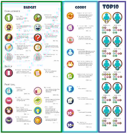 Game design elements: A “goals and badges” board and a panel with the players’ avatars and data were designed (see Figure 1). The goals board was divided into three sections: badges, goods, and leaderboard. The badges were classified into four types: daily, partial, possible to reach multiple times, and hidden or time-limited badges. Each goal showed a brief description and the points earned upon completion, whereas the goods showed a description of the benefit and the points needed to obtain it. Finally, the leaderboard displayed the avatar of the 10 students with the highest number of points.
