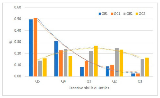 Using the HC model, the evaluations of each student’s activities were weighted. Figure 2 shows the percentage of evaluations for the experimental (E) and control (C) groups, separated into quintiles. The trend lines for each group have also been added to observe the scores’ distribution qualitatively.