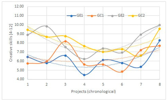 It is noteworthy that activities 4, 5, and 6 showed the lowest grades. These activities required the usage of specific software over which the students did not have mastery; their lack of experience probably explains the notable differences relative to other activities. As Baer (2015) [53] and Aleksić et al. [54] state, creativity requires a certain level of expertise. On the other hand, CTS took a noticeable leap in their final project, associated with a civic association. The work teams were larger than those in the other activities, leading to discussion spaces; also, an increased commitment was evidenced because they worked on an actual project to benefit an association. Both the discussion spaces [1] and the students’ interest in the project [18] were factors that seem to have positively influenced their expression of CTS.