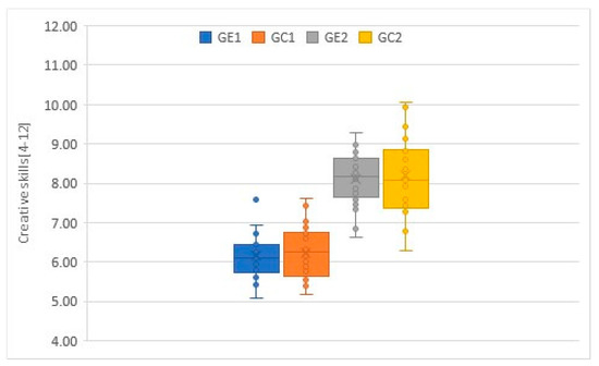 Figure 2 shows the very similar distributions between GE1 and GC1 and between GE2 and GC2. Then, there is no difference in the development of CTS when considering the application of the learning strategies used in this study. However, there is a correlation between the pairs GE1/GC1 and GE2/GC2, associated with the Bicultural and Multicultural programs, respectively. In turn, Figure 3 exhibits no noticeable chronological change in the evaluation of CTS for any group. In other words, there are no differences between the two learning styles; there is also no improvement or detriment to the students’ CTS. However, regarding students’ perception within the experimental groups, they expressed that they had improved their skills due to the AL strategies.