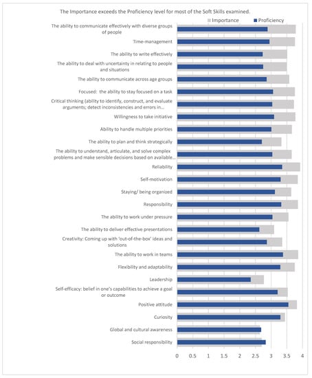 The 26 soft skills were evaluated using a Likert scale of 0 as not important or not proficient to 4 as absolutely essential or absolutely proficient. A paired t-test was conducted to examine the mean of paired differences between each respondent’s rating of importance and proficiency because it was determined that the responses were not independent of each other [54]. The mean of the paired differences resulted in 24 of the 26 soft skills assessed as having a statistically significant difference of the two ratings. The level of importance exceeded the level of proficiency for these 24 soft skills. Figure 1 depicts the comparison of the levels of importance and the levels of proficiency for each of the soft skills; the entries are presented in rank order from greatest to least of the means of the paired difference values. Table 4 is presented based upon the ranking for the level of proficiency and depicts the mean value for each of the soft skills and the mean of the paired differences.
