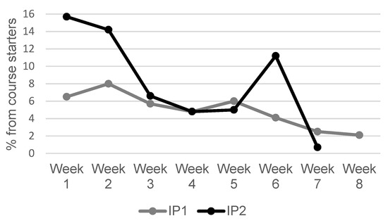 Previous studies are contradictory about the periods of MOOCs when the dropout rate is the highest. There are a group of learners who do not interact with the course after registration and abandon the course before it starts [1,7,12]. It has been found that learners who start with the course activities earlier in a learning week are more likely to stay until the end of the course [23]. It is concluded that the number of learners who completed learning activities decreased each week [8,10]. Multiple MOOCs lasting 6–10 weeks have shown that the dropout rate was high before or at the mid-point of the course [2,4] or after the second quartile, usually during the second or third week or module [5]. Other studies have found that dropouts in the case of 4–11-week MOOCs is most problematic at the start of the course [1,11], especially in the first week [11]. Quick stabilisation of the number of active learners occurs in the case of 4–7-week courses [1]. During longer courses, stabilisation takes place from the sixth week [9]. When learners do not have a weekly schedule and can finish the modules at their own pace, most learners drop out during the first module. The dropout rate decreases in the second module and stabilises afterward [14].