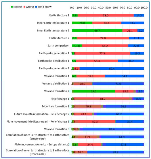 After the implementation of the questionnaire, we performed qualitative and quantitative analysis of the students’ answers on geodynamic phenomena. Figure 1 depicts the percentages of scientifically accepted answers, not scientifically accepted answers and ‘I don’t know/I don’t reply’ answers. Scientifically accepted answers record especially low percentages, even close to zero. On the contrary, not scientifically accepted answers display high percentages compared to the former. ‘I don’t know/I don’t reply’ answers show as high percentages as not scientifically accepted ones. These data, along with the qualitative analysis of students’ answers, frame a general picture of A class junior high school geoscience level which implies that students graduating from Greek primary school lack basic geoscience knowledge, confuse geoscience concepts and bear plenty of alternative ideas.