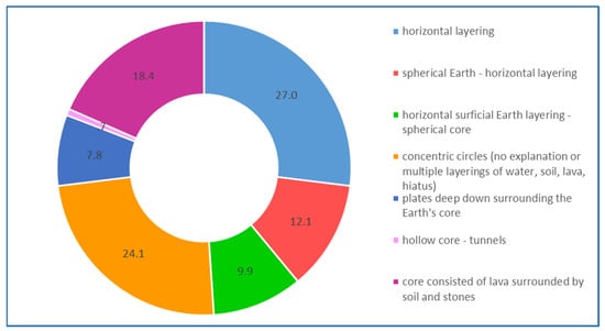 Students’ earth structure alternative ideas are summarized in Figure 2 and we emphasize four cases. An unexpectedly high percentage of students insists on horizontal Earth layering despite the vast amount of information on Earth structure they receive from multiple resources (books, internet, and school). It is an initial concept that students compose after their own observation that the ground they live on seems to be horizontal (optical stimulus) no matter what.