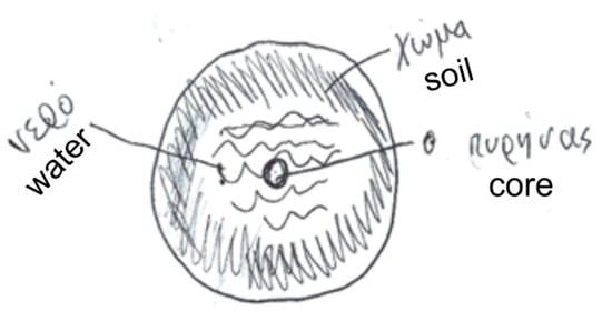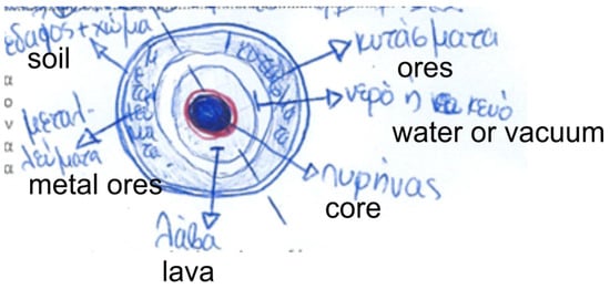 Another interesting and frequently drawn concept is that Earth structure consists of concentric circles (Figure 3), which students: (a) show cognitional weakness of defining, (b) describe as multiple alternations of water, soil, lava, hiatus, ores, etc., or (c) compare to an onion (resembling Earth structure to an onion) without further explanation (Figure 4b), just like the Greek primary school textbook describes as mentioned above.