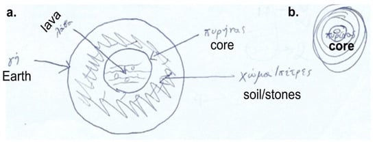 Similarly, in Figure 4a, another student’s synthetic alternative idea is also drawn. The student sketches a spherical core (incoming information) which is filled with lava (incoming information from the primary school dictionary) with horizontal layering (initial concept-direct observation from supposed horizontal ground). The core is surrounded by soil/stones (initial concept from immediate optical stimulus obtained from natural environment) of enormous thickness within a spherical Earth (incoming information). Nevertheless, the student is not certain about the explanation he/she presents in Figure 4a. Thus, the same student makes a second, alternative description in a smaller sketch (Figure 4b). The fact that the sketch is smaller than the first one is assumed to imply his/her insecurity about the latter case, too. In that case, (Figure 4b), the student compares inner Earth structure to an onion, just like the geography primary school textbook. This occasion verifies the confusion that prevails in the student’s conceptual frame on geodynamic phenomena, as mentioned in the introductive paragraph of the results. It is apparent that this confusion is founded on the fact that geodynamic structures and procedures cannot be observed in the surrounding environment and hence visualized by people due to their spatial and time scale, as is already mentioned by Love [26] and Orion and Ault [60]. Additionally, when students offer two alternative cases in their responses, just like our occasion, Siegal et al. [61] argue that these students depict incoherence or fragmented “knowledge”, because they hold both intuitive concepts and scientific information which are not interconnected.