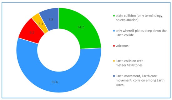 Students hold many alternative ideas on earthquake generation (Figure 6), most of which are mentioned in international literature (e.g., [10,11,12,15,16,17,18,20,22,32,34]). In this paper, we comment on two outstanding cases.