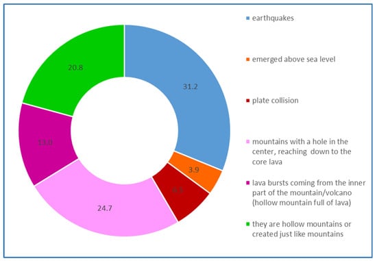 Another interesting concept is that volcanos form just like mountains (20.8%), while just previously we recorded students’ ideas attributing volcanos to earthquakes and vice versa. These perplexing concepts confirm the confusion that prevails in students’ conceptual frame as far as mountain, volcano, and earthquake formation are concerned and their struggle to manage within the context of causal procedures. Additionally, it is not accidental that this 20.8% approximates the 24.7% in the previous paragraph supporting the influence of wrong definitions.