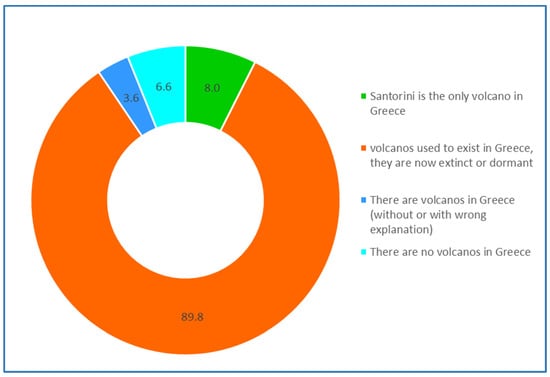 Students’ alternative ideas on volcano formation are presented in Figure 8, from which we outline three cases. In the first one, a high percentage of students (31.2%) attributes volcano formation to earthquake occurrence, while 9.2% of students claim that earthquakes occur due to volcanos (Figure 6). At this point it is worth mentioning that the vast majority (89.8%) of students believe that there are no volcanos in Greece, while 8% believe that Santorini island is the only volcano in Greece and think of it as inactive (Figure 9). Furthermore, 38.3% describe Greece as a highly earthquake prone country (Figure 10). These concepts along with their percentages reveal that Greek students’ conceptual frame on geodynamic phenomena is more influenced by seismic rather than volcanic activity. We assume it is due to the high seismic activity in Greece, its severe results, and its social, psychological, and economic impact on humans and especially on children.
