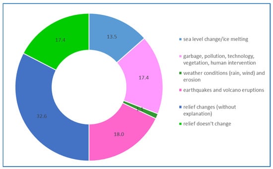 As far as surface relief change is concerned, 32.6% of students accept that the relief changes without, however, being able to justify their answer (Figure 11). According to 13.5% of students, relief change is attributed to air temperature rise, to consequent ice melting, and thus to sea level uplift. The same students believe that this will cause the Mediterranean Sea to flood and expand in the future. This idea shares a resemblance with students’ concept that plate movement depends on climate change, therefore the Atlantic Ocean is a kind of valley which has been filled with sea water because of sea level rise [30]. Other students (17.4%) attribute relief change to garbage accumulation, pollution, technology evolution, and generally human intervention. We believe that students are ‘forced’ to point out these parameters as relief change controllers—though they are not Earth associated—because these parameters are broadly presented through media and news in our everyday life (current affairs), affect our lives directly or indirectly, are social-centered and are usually human controlled. All these in terms of optical stimuli absence of geodynamic phenomena amplify this enforcement. Similarly, students in USA claim that plates move on account of surface events (hurricanes, meteors), features (air, water, glaciers), and human impact according to McDonald et al. [30]. Thus, it is obvious that these parameters definitely configure students’ alternative ideas and therefore their conceptual frame, apart from social, cultural, psychological, cognitional, and environmental [15,17,18,22,47,51,53].