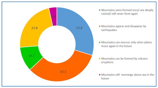 We focus on three initial alternative ideas of students, about whether mountains can be formed again in the future or not (Figure 12). Exactly one in three students (33.3%) states that mountains can be either destroyed or reformed by earthquakes verifying the finding about the correlation between concept construction and earthquake occurrence proximity. Although 22.8% insist that mountains will be reborn by volcano explosion in the future. It is not a coincidence that mountain and generally relief formation is highly attributed to earthquakes and volcanos, exactly as the Balkan peninsula relief is claimed to be formed by the geological processes (earthquakes and volcanos) in the geography textbook. Furthermore, 29.8% of students proclaim that mountains are not going to form again in the future and they are deeply rooted. Finally, 10.7% reply that mountains can reoccur in the future (instantaneous event) only when plates move again in the future (instantaneous event). This concept is identical to the aforementioned idea that an earthquake can occur only if/when plates collide in the future. Thus, it validates the finding that students ignore the continuity of geodynamic phenomena and consider them as instantaneous and separate events. This ignorance might derive from either inherent but natural disability due to age level or unproper geoscience education, transmitted for instance by the textbooks of primary school.