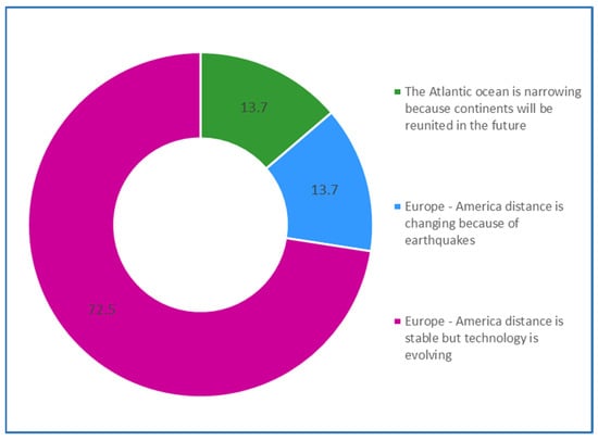 A question in the questionnaire of the study asked: ‘The journey between Europe and America will last longer after a few million years in the future. Could you explain why?’ Despite the declaration that the trip will last longer, about 86.2% of students rejected this declaration proclaiming (Figure 13):