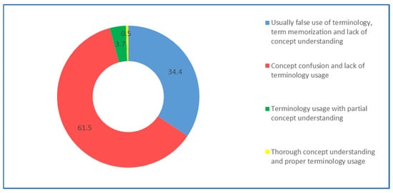 In the present research, terminology usage and concept comprehension by students was also evaluated, as shown in Figure 14. We focus on the 34.4% of students, which represents an extensive usage of scientific terminology. However, the terms are usually mispronounced, falsely used, and falsely described, facts that prove lack of concept comprehension. It is obvious that this high percentage (34.4%) displays students’ belief that learning is the memorization of scientific terminology, a fact that disorientates them from real and deep learning procedures. It also indicates the extended terminology usage in textbooks, which is usually either partially (or not at all) explained or too specialized for this age level. This extended, but partially explained, terminology usage by textbook writers could be attributed to (a) their expertise, (b) their probable ignorance of students’ cognitional level and alternative ideas, (c) their inadequacy or ignorance of the necessity that scientific information must be transformed and adjusted to students’ cognitional and age level, and (d) their ignorance that scientific terms might hold a different meaning for them as for the novices due to conceptual metaphors [9]. Consequently, students are driven to prefer the easy way of terminology memorization than searching for concept meanings and the causes of phenomena, which are brain consuming processes, neglecting understanding. Thus, for example, Greek students frequently use the terminology ‘Plate collision’ to justify many of the geodynamic phenomena without being able to explain or describe the concepts. Accordingly, Libarkin et al. [20] claim that many students use scientific terms such as magma, mantle, core, lithosphere, plates, or even plate tectonics, which they are unable to explain. They also report that early high school students are exposed to geoscience concepts and terminology, but most demonstrate incomplete understanding. Finally, they conclude that incorporation of scientific terminology into an explanation does not necessarily imply understanding, a conclusion that supports the findings of this research. Furthermore, Dolphin and Benoit [9] elucidate how conceptual metaphors can lead to the construction of misconceptions by utilizing common terms—words—from the mesocosm (plate) in scientific phrases (tectonic plate) and thus unconsciously transferring properties from the source to the target of the analogy.