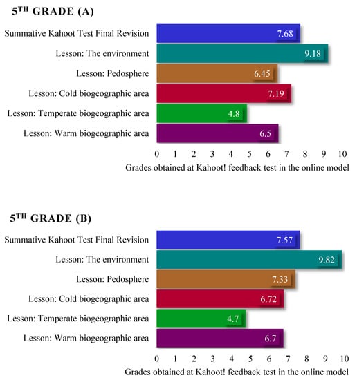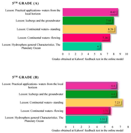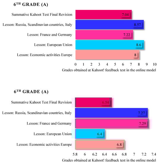 In the second stage of research, standardized assessments with the Kahoot! game were also applied for six class hours where geography was being studied (in the 5th, 6th, 9th, and 10th grades) in order to observe the level of knowledge acquired in the traditional and online teaching–learning–assessment models compared to the online only model. The results obtained by the students in each class were synthesized and are reflected in Figure 5 (5th grade), Figure 6 (6th grade), Figure 7 (9th grade), and Figure 8 (10th grade), which reflect a similar level of knowledge for all of the classes included in the research.