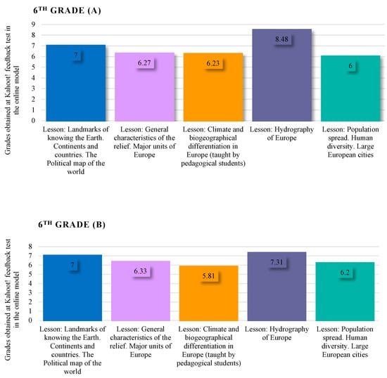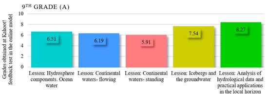 In the first phase of research, standardized assessments were applied on the Kahoot! learning platform for five class hours where geography was being studied (in the 5th, 6th, 9th and 10th grades) in order to observe the level of knowledge acquired in the online teaching–learning–assessment model. The results obtained by the students in each class were synthesized and are illustrated in Figure 1 (5th grade), Figure 2 (6th grade), Figure 3 (9th grades), and Figure 4 (10th grade) and reflect a similar level of knowledge for all of the classes included in the research.