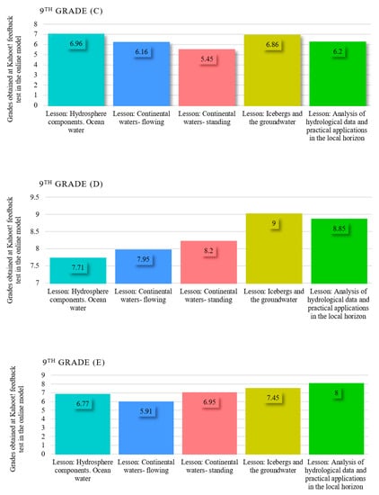 In the 9th grade, the averages per class in the online model (Figure 5) were 6.88 (9th grade A), 6.32 (9th grade C), 8.34 (9th grade D), 7.00 (9th grade E), 8.20 (9th grade F), 7.13 (9th grade G), 8.04 (9th grade E), 8.04 (9th grade E), 8.04 (9th grade E), 8.20 (9th grade F), 7.13 (9th grade G), 8.04 (9th grade G), and 8.04 (9th grade H) compared to the traditional model (Figure 6), which had averages of 7.49 (9th grade A), 7.69 (9th grade C), 7.97 (9th grade D), 7.80 (9th grade E), 8.07 (9th grade F), 8.07 (9th grade G), and 7.36 (9th grade H).