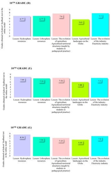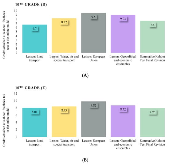 Evolution of student grades in the assessment sequence of the Kahoot! interactive game; type—traditional model of teaching–learning–assessment—10thGrade parallel classrooms D, E and G.