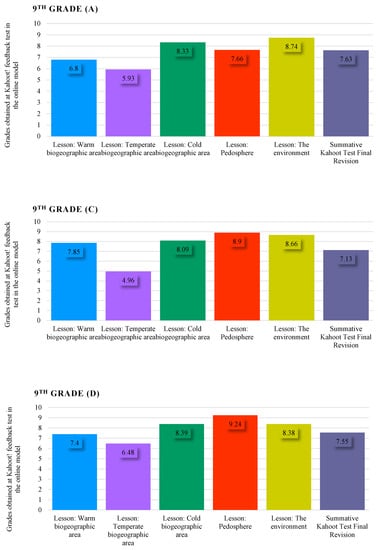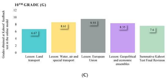 Evolution of student grades in the assessment sequence of the Kahoot! interactive game; type—traditional model of teaching–learning–assessment—10th Grade parallel classrooms D (A), E (B) and G (C).